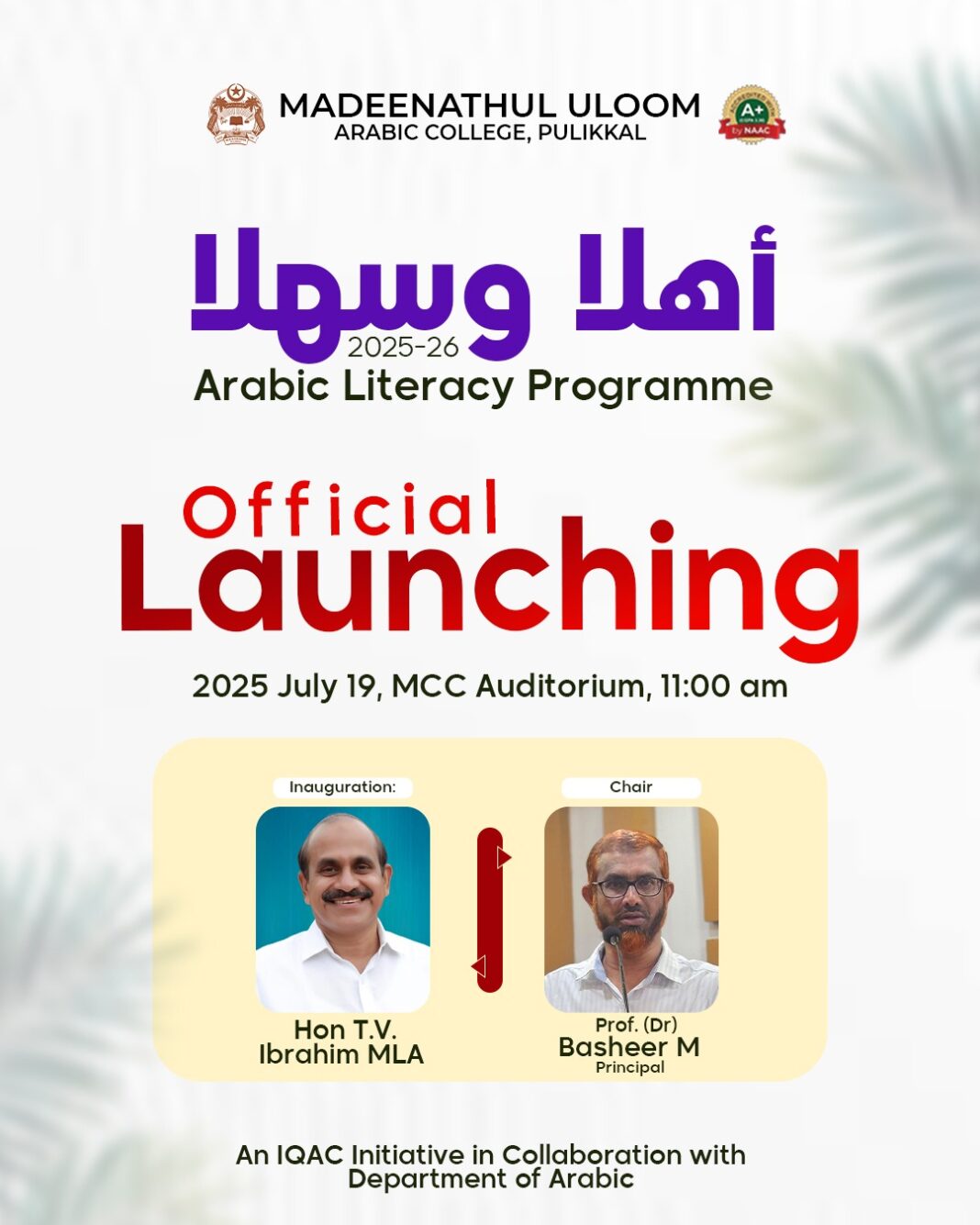 കൊണ്ടോട്ടി/പുളിക്കൽ: പുളിക്കൽ മദീനത്തുൽ ഉലൂം അറബിക് കോളേജ് രക്ഷിതാക്കൾക്കും കോളേജിന്റെ അയൽ പ്രദേശങ്ങളിലെ മുതിർന്നവർക്കും വേണ്ടി ഈ അധ്യയന വർഷം നടപ്പിലാക്കുന്ന നൂതന പദ്ധതിയായ *അഹ്ലൻ വ സഹ്ലൻ* അറബി കോഴ്സിന്റെ ഔപചാരിക ഉദ്ഘാടനം ഇന്ന് രാവിലെ 11 മണിക്ക് ടി വി ഇബ്രാഹിം എംഎൽഎ നിർവഹിക്കും. കോളേജ് ഐ ക്യു എ സിയുടെ മേൽനോട്ടത്തിൽ അറബിക് വിഭാഗം വിഭാവനം ചെയ്ത ആറുമാസം നീണ്ടു നിൽക്കുന്ന 30 മണിക്കൂർ കോഴ്സ് ഓൺലൈൻ-ഓൺലൈൻ ഹൈബ്രിഡ് മോഡിലാണ് നടക്കുക. യു എൻ അംഗീകരിച്ച വിശ്വഭാഷയായ അറബിയെ ജനകീയമാക്കുക, താഴെ തട്ടിൽ എത്തിക്കുക എന്നീ ലക്ഷ്യങ്ങളോടെ സംവിധാനിച്ച ഈ കോഴ്സ് പൂർത്തിയാക്കുന്നവർക്ക് അംഗീകൃത സാക്ഷ്യപത്രങ്ങളും ഉന്നത വിജയികൾക്ക് പാരിതോഷികങ്ങളും വർഷാവസാനം നടക്കുന്ന ചടങ്ങിൽ വിതരണം ചെയ്യും. എം.സി.സി ഓഡിറ്റോറിയത്തിൽ നടക്കുന്ന പരിപാടിയിൽ പ്രിൻസിപ്പൽ പ്രൊഫ. ഡോ. ബഷീർ മാഞ്ചേരി അധ്യക്ഷത വഹിക്കും. കോഴ്സ് കോർഡിനേറ്റർ ഡോ. സഫീന എ. കെ, വൈസ് പ്രിൻസിപ്പലും അറബിക് വിഭാഗം മേധാവിയുമായ ഡോ. മുനീർ മദനി, റിസർച്ച് സെൻറർ കോർഡിനേറ്റർ ഡോ. സാബിർ നവാസ് സി.എം, ഐ.ക്യു.എ.സി കോർഡിനേറ്റർ ഡോ. മുഹമ്മദ് ബഷീർ സി കെ, ഡോ. മുഹ്തസിം ബില്ല ടി.പി, ഡോ. നിഷാദലി വി, മുഹ്സിന പി.വി, ഫർസാന കെ, സഈദ പി, അഫ്സൽ മാഹീൻ, ഹഫ്സത്ത് ഉടുമ്പ്ര, അഫ്സൽ എം ടി പ്രസംഗിക്കും.
