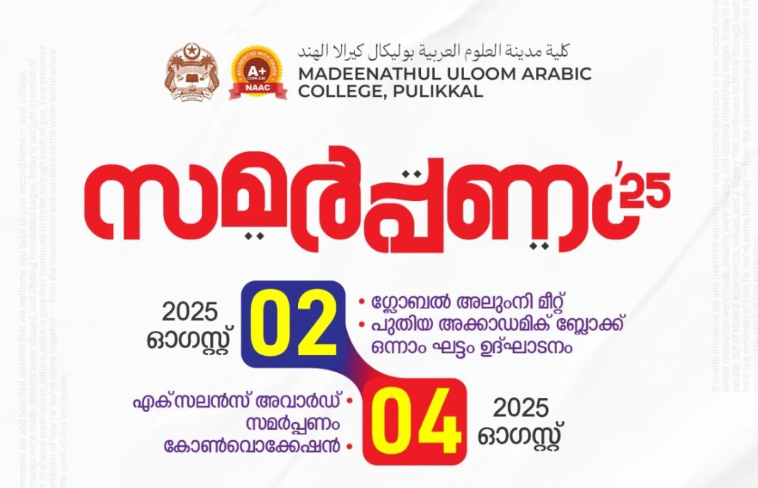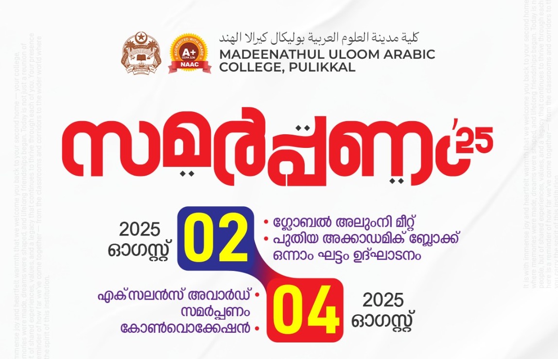 പുളിക്കൽ/ കൊണ്ടോട്ടി : സമർപ്പണം 25 മദീനത്തുൽ ഉലൂം അറബിക് കോളേജ് മെഗാ കോൺഫറൻസിന് ആഗസ്റ്റ് രണ്ടിന് തുടക്കമാവും. പുതിയ അക്കാഡമിക് ബ്ലോക്ക് ഒന്നാം ഘട്ടം ഉദ്ഘാടനം, ഗ്ലോബൽ അലുംനി മീറ്റ്, എക്സലൻസ് അവാർഡ് സമർപ്പണം, കോൺവെക്കേഷൻ എന്നീ വിപുലമായ പരിപാടികളാണ് സമർപ്പണം 25 കോൺഫറൻസിന്റെ ഭാഗമായി എംസിസി നഗറിൽ പ്രത്യേകം സജ്ജമാക്കിയ പന്തലിൽ നടക്കുന്നത്. ആഗസ്റ്റ് രണ്ടിന് രാവിലെ 9.30ന് പുതിയ അക്കാഡമിക് ബ്ലോക്കിന്റെ ഉദ്ഘാടനം കോളേജ് കറസ്പോണ്ടന്റ് ടി പി അബ്ദുല്ലക്കോയ മദനി നിർവഹിക്കും. അഡ്വ. ഹാരിസ് ബീരാൻ എം.പി. സമർപ്പണം 25 കോൺഫറൻസ് ഉദ്ഘാടനം ചെയ്യും. പ്രിൻസിപ്പൽ പ്രൊഫ. ഡോ. ബഷീർ മാഞ്ചേരി ആമുഖ ഭാഷണം നിർവഹിക്കും. സ്വാഗതസംഘം ചെയർമാൻ പ്രൊഫ. കെ പി അബ്ദു റഷീദ് അധ്യക്ഷത വഹിക്കും. മുൻ പ്രിൻസിപ്പൽ ഡോ. സയ്യിദ് മുഹമ്മദ് ശാക്കിർ ഉപഹാര സമർപ്പണം നടത്തും. തുടർന്ന് നടക്കുന്ന ഗ്ലോബൽ അലുംനി മീറ്റ് കോളേജിന്റെ ജീവിച്ചിരിക്കുന്ന ഏറ്റവും മുതിർന്ന പൂർവ വിദ്യാർഥി പി കെ അബ്ദുൽ മജീദ് മദനി വലിയോറ ഉദ്ഘാടനം ചെയ്യും. ഇന്ത്യക്ക് സ്വാതന്ത്ര്യം കിട്ടുന്നതിനു കൃത്യം ഒരു മാസം മുമ്പ് 1947 ജൂലൈയിൽ സ്ഥാപിക്കപ്പെട്ട കോളേജിൽ നിന്ന് ഇതപര്യന്തം പുറത്തിറങ്ങിയ പൂർവ വിദ്യാർഥികൾ പങ്കെടുക്കുന്ന സംഗമത്തിൽ ഡോ. മുനീർ മദനി പ്രൊജക്റ്റ് അവതരണം നിർവഹിക്കും. കോളേജ് മാനേജിംഗ് കമ്മിറ്റി പ്രസിഡണ്ട് പി മുഹിയുദ്ദീൻ മദനി ഫണ്ട് ഉദ്ഘാടനം നിർവഹിക്കും. കേരള ജംഇയ്യത്തുൽ ഉലമ ട്രഷറർ ഈസാ മദനി ഏറ്റുവാങ്ങും. കെ ജെ യു സെക്രട്ടറി ഹനീഫ് കായക്കൊടി, ഡോ. എൻ മുഹമ്മദലി അൻസാരി, അബ്ദുൽ അസീസ് തേങ്ങാട്ട്, എം സ്വലാഹുദ്ദീൻ മദനി, ഡോ. സാബിർ നവാസ് സി എം, ഡോ. ടി കെ യൂസഫ് ചടങ്ങിൽ പ്രസംഗിക്കും.