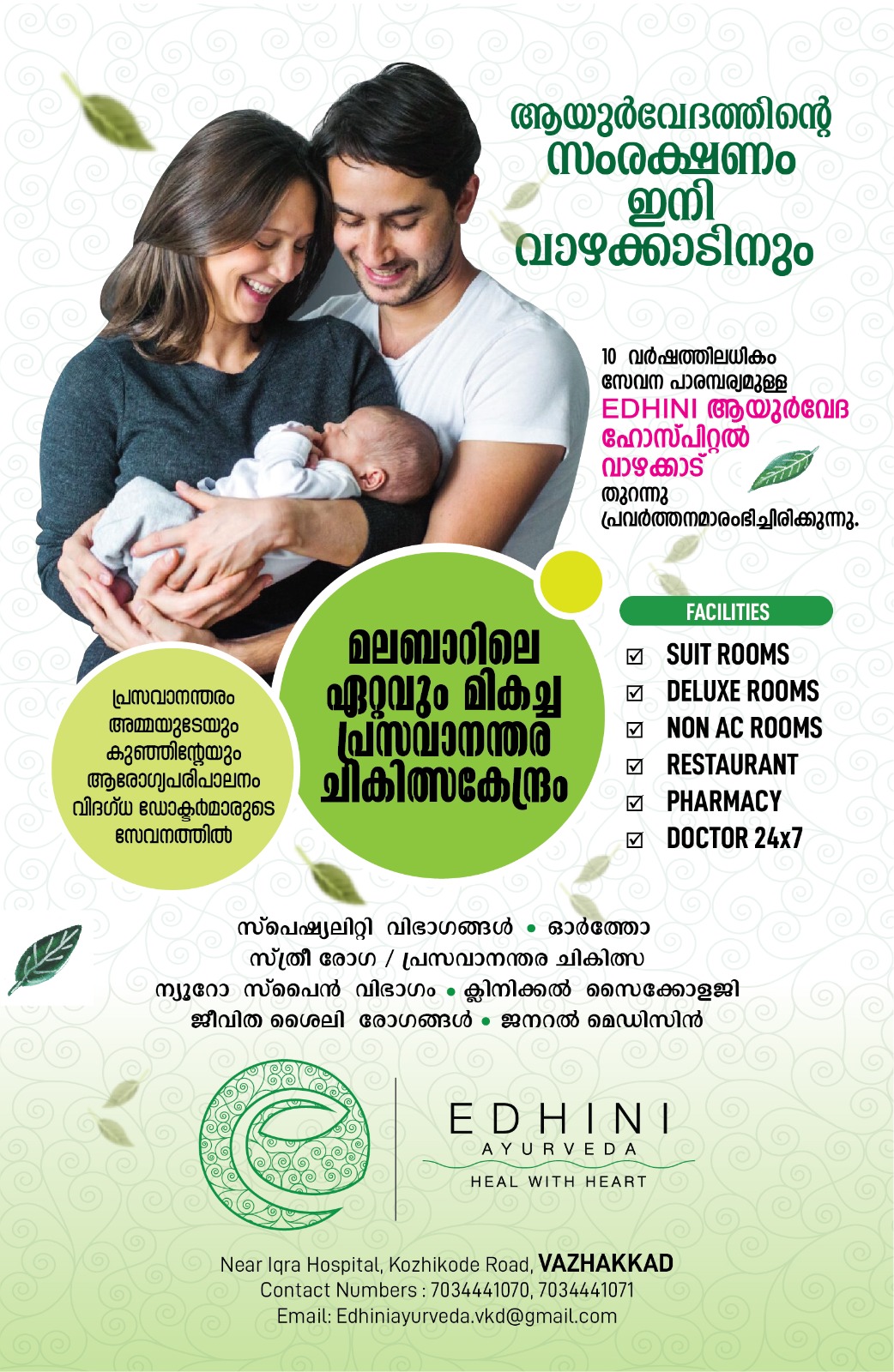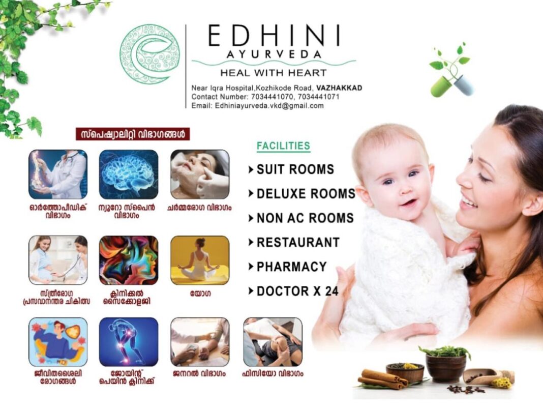 10 വർഷത്തിലധികം സേവന പാരമ്പര്യമുള്ള എധിനി ആയുർവേദ ഹോസ്പിറ്റൽ വാഴക്കാടും പ്രവർത്തനമാരംഭിച്ചിരിക്കുന്നു