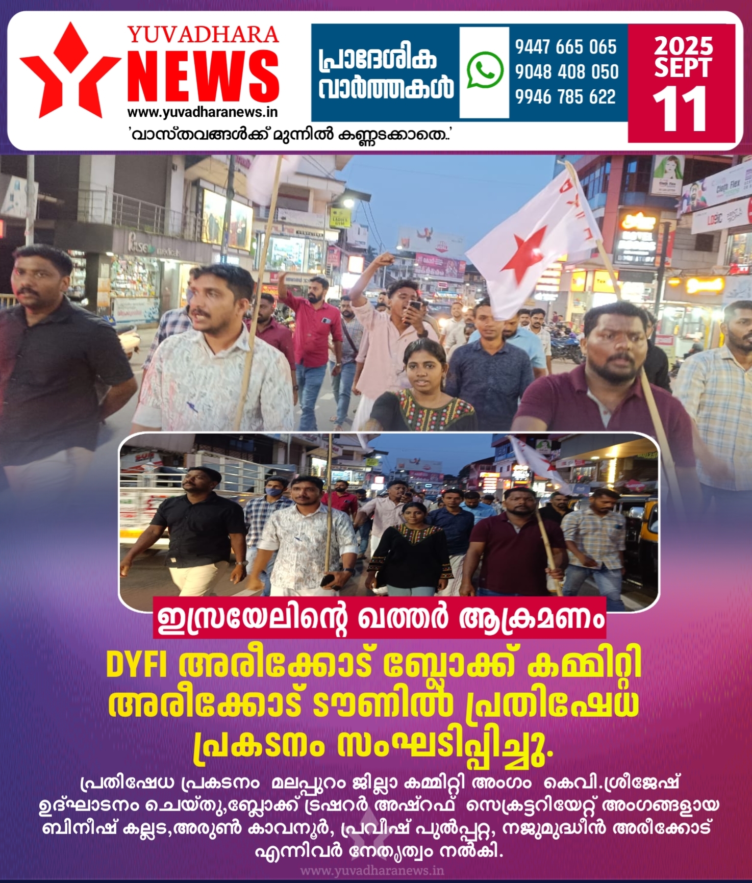 പ്രതിഷേധ പ്രകടനം മലപ്പുറം ജില്ലാ കമ്മിറ്റി അംഗം കെവി.ശ്രീജേഷ് ഉത്ഘാടനം ചെയ്തു,ബ്ലോക്ക് ട്രഷറർ അഷ്റഫ് സെക്രട്ടറിയേറ്റ് അംഗങ്ങളായ ബിനീഷ് കല്ലട,അരുൺ കാവനൂർ, പ്രവീഷ് പുൽപ്പറ്റ, നജുമുദ്ധീൻ അരീക്കോട് എന്നിവർ നേതൃത്വം നേതൃത്വം നൽകി.