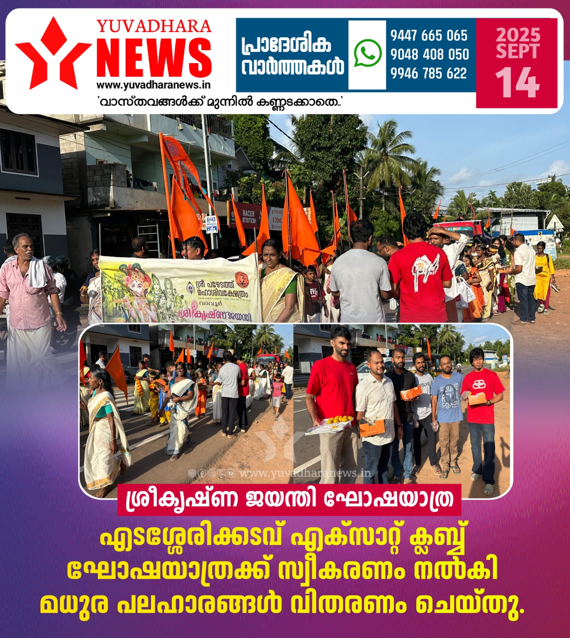 എടശ്ശേരിക്കടവ്: എക്സാറ്റ് ക്ലബ്ബ് ശ്രീകൃഷ്ണ ജയന്തി ഘോഷയാത്രക്ക് സ്വീകരണം നൽകി മധുര പലഹാരങ്ങൾ വിതരണം ചെയ്തു.