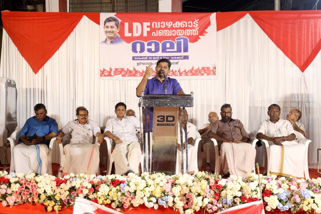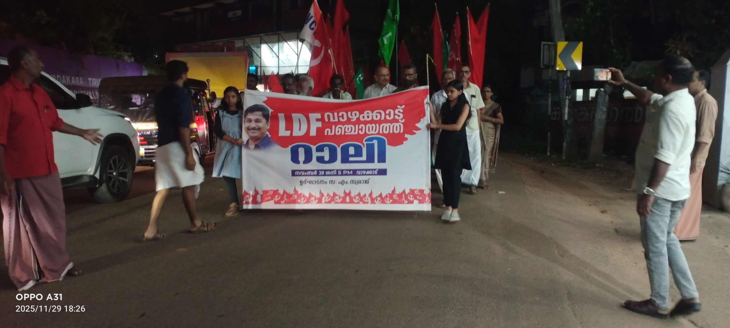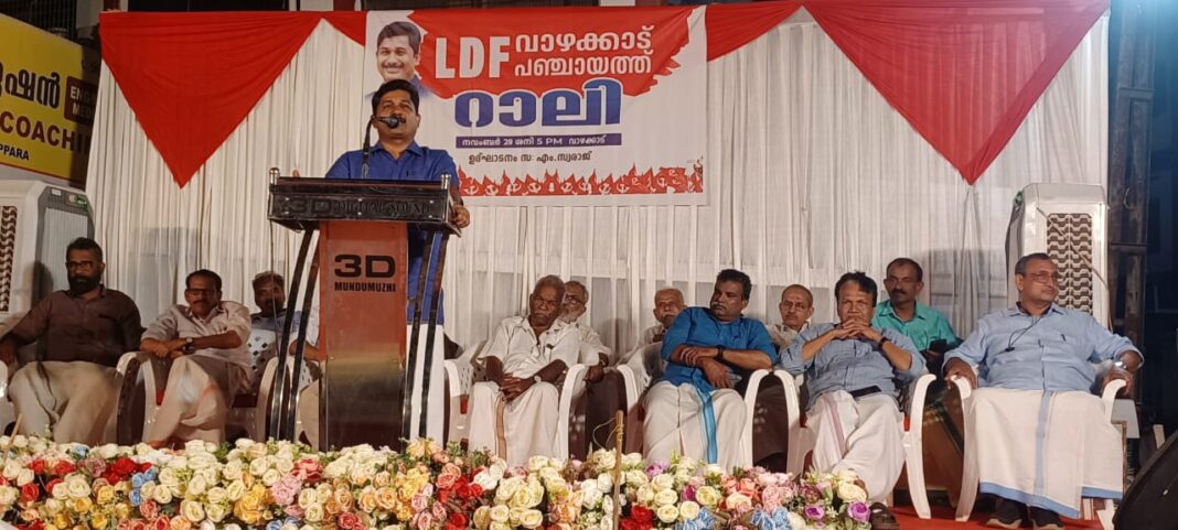 വാഴക്കാട് : ത്രിതല പഞ്ചായത്ത് തിരഞ്ഞെടുപ്പിൻ്റെ ഭാഗമായി എൽഡിഎഫ് വാഴക്കാട് പഞ്ചായത്ത് കമ്മറ്റിയുടെ നേതൃത്വത്തിൽ തിരഞ്ഞെടുപ്പ് റാലി സി പി ഐ എം സംസ്ഥാന സെക്രട്ടറിയേറ്റ് അംഗം എം സ്വരാജ് ഉൽഘാടനം ചെയ്തു. പൊതുസമ്മേളനം വി രാജഗോപാലൻ മാസ്റ്റർ സ്വാഗതം പറഞ്ഞു.