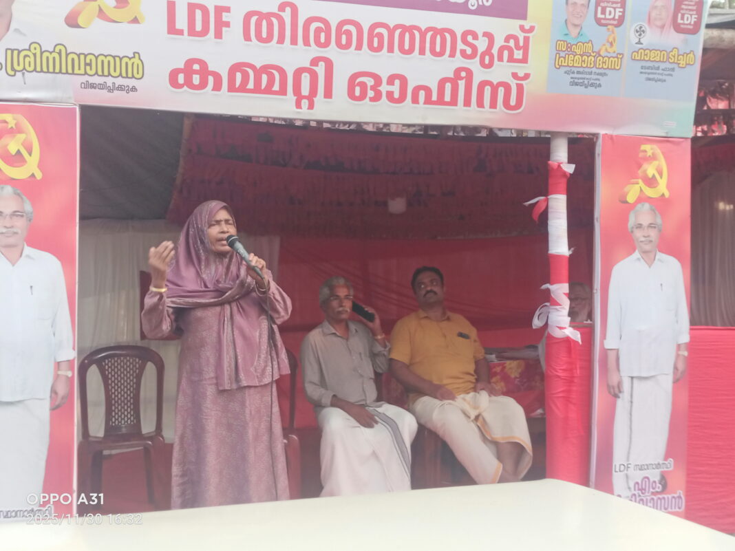 നാടിൻറെ നന്മയ്ക്കായി തിരഞ്ഞെടുപ്പ് ചിഹ്നമായ ടേബിൾ ഫാൻ അടയാളത്തിൽ വോട്ടുകൾ രേഖപ്പെടുത്തണമെന്ന് ഹാജർ ടീച്ചർ ജനങ്ങളോട് അഭ്യർത്ഥിച്ചുകൊണ്ട് സംസാരിച്ചു.സിപിഐഎം നേതാക്കളായ എ പി മോഹൻദാസ്, രതിഷ് കുമാർ, സുരേഷ് കുമാർ,അബ്ദുൽ അലി മാസ്റ്റർ,കെപിഎം സാദിഖ് തുടങ്ങിയവർ സ്ഥാനാർത്ഥിയോടൊപ്പം അനുഗമിച്ചു.