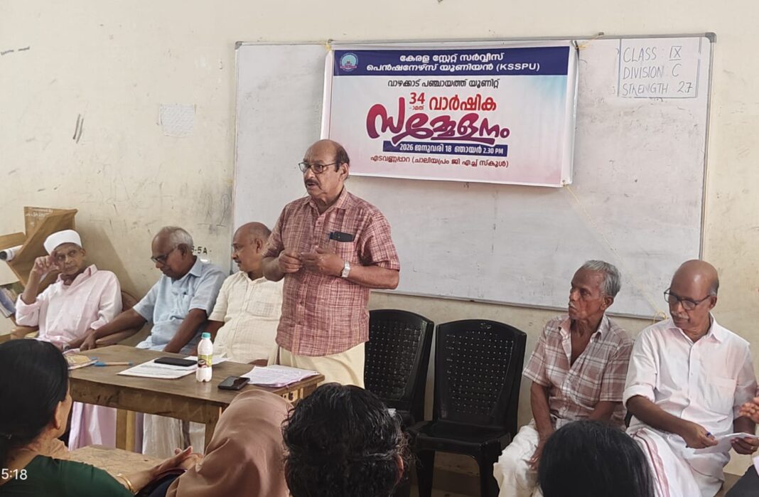 വാഴക്കാട് : കെഎസ്എസ് പി യു ( കേരള സ്റ്റേറ്റ് സർവീസ് പെൻഷനേഴ്സ് യൂണിയൻ ) വാഴക്കാട് യൂണിറ്റ് 34ാം വാർഷിക സമ്മേളനം ജില്ലാ രക്ഷാധികാരി എ കുഞ്ഞുണ്ണി നായർ ഉദ്ഘാടനം ചെയ്തു മെഡിസെപ്പ് പദ്ധതിയിലെ അപാകതകൾ പരിഹരിക്കണമെന്ന് പ്രമേയത്തിലൂടെ ബന്ധപ്പെട്ടവരോട് ആവശ്യപ്പെട്ടു പ്രസിഡണ്ട് മുഹമ്മദലിയുടെ അധ്യക്ഷതയിൽ ചേർന്ന സമ്മേളനത്തിൽ ടൗൺ കമ്മിറ്റി സെക്രട്ടറി സുരേഷ് സംഘടനാ റിപ്പോർട്ട് അവതരിപ്പിച്ചു സംഘടനയിൽ അംഗമായി പഞ്ചായത്ത് മെമ്പർ ആയി തിരഞ്ഞെടുക്കപ്പെട്ട സി ഭാസ്കരൻ , ഏറ്റവും നല്ല വനിതാ കർഷക യായി തിരഞ്ഞെടുക്കപ്പെട്ട വസന്തകുമാരി 80 വയസ്സ് കഴിഞ്ഞ കെ.ടി അബ്ദുള്ള, സത്യനാഥൻ എന്നിവരെ അനുമോദിച്ചു പുതിയ ഭാരവാഹികളായി പ്രസിഡണ്ട് മുഹമ്മദ് അലി സെക്രട്ടറി ഇ. വേണുഗോപാലൻ ട്രഷറർ ശിവദാസൻ എന്നിവരെ തിരഞ്ഞെടുത്തു വികെ അശോകൻ സ്വാഗതവും ശിവദാസൻ നന്ദിയും പറഞ്ഞു
