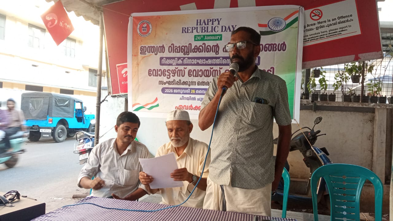 ചിറയിൽ : തെരുവോര ചർച്ച നടത്തി 77 ആം ഇന്ത്യൻ റിപ്പബ്ലിക് ദിനത്തോടനുബന്ധിച്ചു റിപ്പബ്ലിക്കിന്റെ പിന്നാമ്പുറങ്ങൾ എന്ന വിഷയത്തിൽ കൊണ്ടോട്ടി വോട്ടേഴ്സ് വോയ്സ് ചിറയിൽ ചുങ്കത്തു വെച്ച് തെരുവോര ചർച്ച നടത്തി.