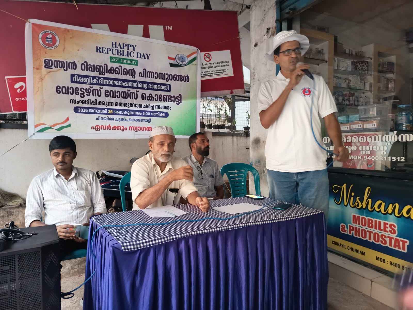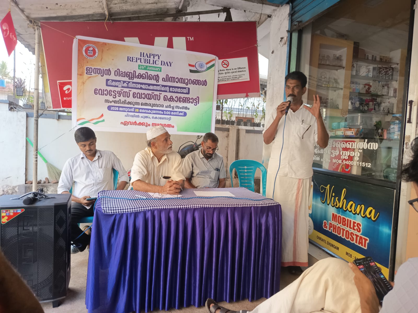 കൊണ്ടോട്ടി മുനിസിപ്പൽ കൗൺസിലർ പി സി മണി ഉത്ഘാടനം ചെയ്തു ഇന്ത്യൻ മതേതര റിപ്പബ്ലിക്കിന് അനേകം വെല്ലുവിളികൾ ഉയരുന്ന സാഹചര്യത്തിൽ ജനങ്ങൾ ഭരണഘടന ഉയർ ത്തിപ്പിടിക്കാനും അതിലെ മൂല്യങ്ങൾ സംരക്ഷിക്കാനും ജാഗ്രതയോടെ നില കൊള്ളണമെന്ന് ചർച്ചയിൽ അഭിപ്രായം ഉയർന്നു ട്രഷറർ കെ പി മൊയ്തു ഹാജി അധ്യക്ഷത വഹിച്ചു പ്രസിഡന്റ് കെ കെ റസാഖ് മാസ്റ്റർ മുഖ്യ പ്രഭാഷണം നടത്തി എൻ വി പ്രകാശൻ, കെ പി അസീസ് ബാവ, ജലീൽ അച്ചുകൊമ്പൻ, ജലീൽ മിസ്ബാഹി, അബ്ദുറഹിമാൻ ചിറയിൽ, കെ പി സൽമാൻ, ചുക്കാൻ ചെറിയ ബിച്ചു, എന്നിവർ ആശംസാ പ്രസംഗം നടത്തി.